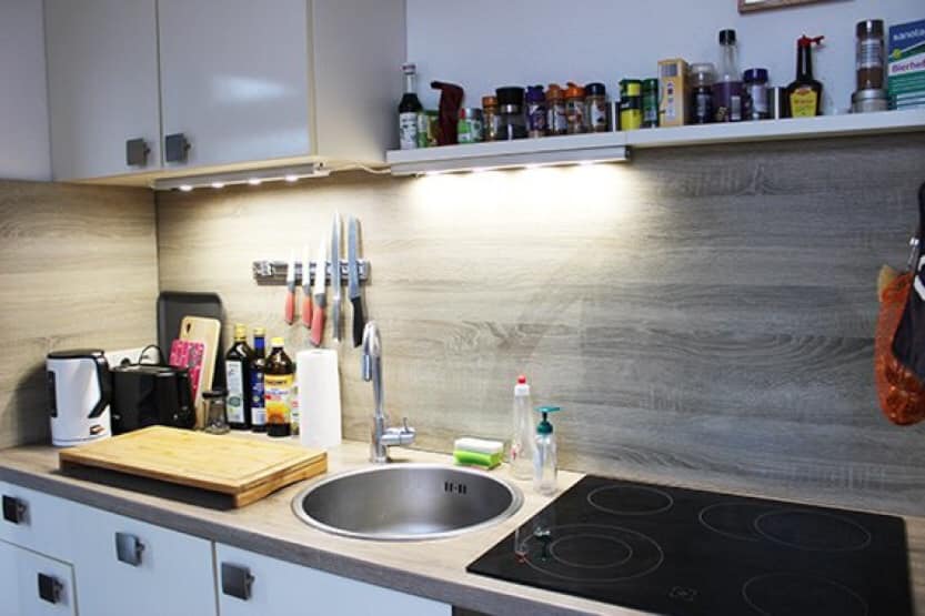 - Kitchen with built-in cabinets and hob