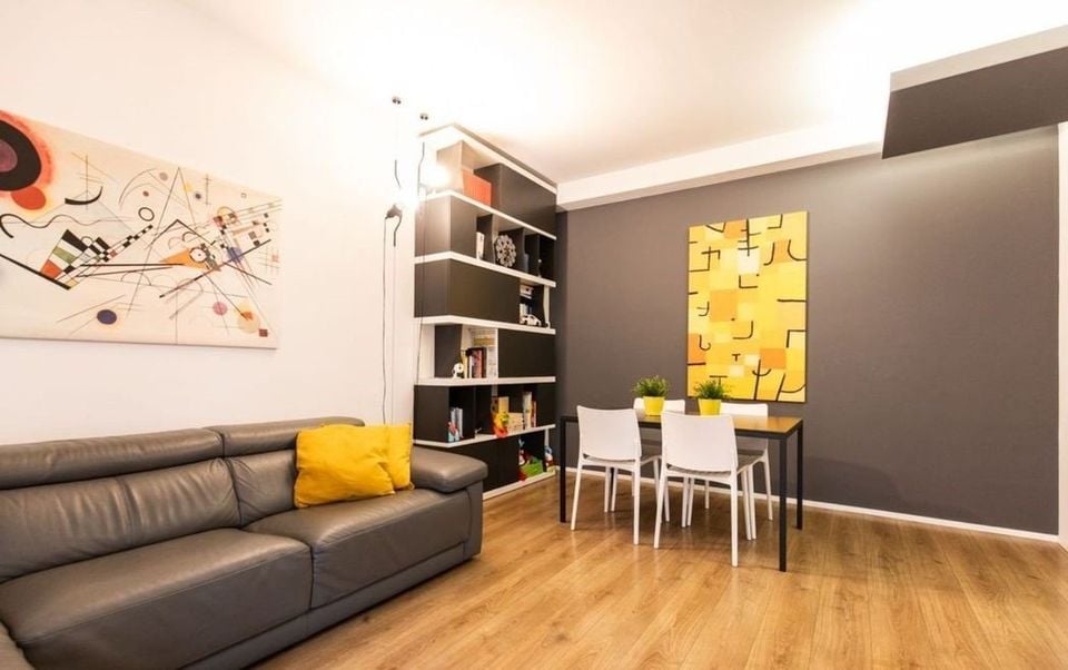 Rectangular and well-ventilated living/dining hall, with a large and bright kitchen.